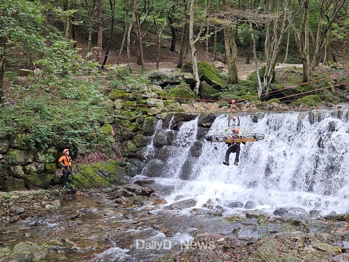 훈련 내용 설명에 이어 △산악사고 특성·주의사항 및 안전사고 방지요령 △산악구조장비 사용법 △계곡 수평구조·수직구조 훈련 △수신호법 교육 △사고자 응급처치법 등의 순으로 진행했다.