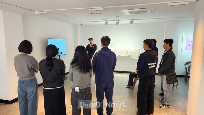 현재 갤러리 신평관에서 오는 31일까지 작품을 선보이는 최대광 작가가 아티스트 토크를 이끌며 작품에 담긴 상징성과 작품 서사, 사용 재료 등에 대해 직접 소개하고, 유학생들과 자유로운 질의응답 시간을 가졌다. 울산대 미술대학 조소과를 졸업하고, TEAF 국제설치미술제를 비롯해 여러 지역의 공공/민간 프로젝트에 참여해 온 최대광 작가는 현재 구미 레지던시 1기 입주작가로 활동하고 있다.