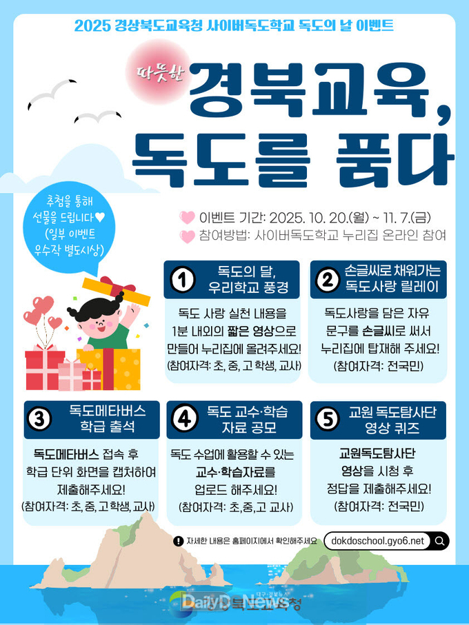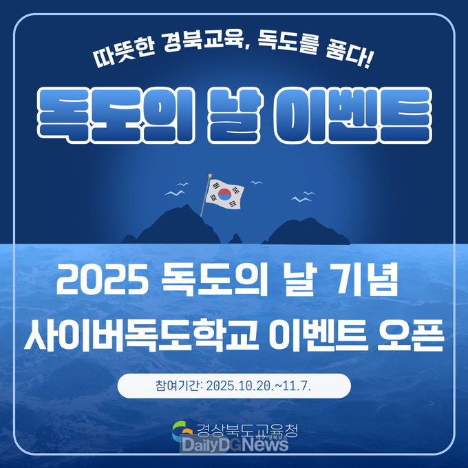 (데일리대구경북뉴스=황지현 기자)경북교육청(교육감 임종식)은 독도의 날(10월 25일)을 맞아 10월 20일부터 다음 달 7일까지 3주간, 전 국민이 참여할 수 있는 ‘2025 독도의 날 기념 독도사랑 온라인 축제’를 운영할 예정이다.