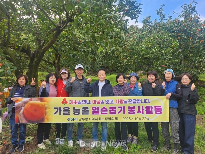 (데일리대구경북뉴스=황지현 기자)경산시 남부동지역사회보장협의체(공동위원장 정성극)는 10월 22일 청도읍에 위치한 ‘사랑 나눔 농장’에서 봉사활동으로 감을 수확하여 이웃사랑 실천에 앞장섰다.