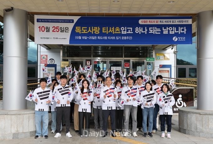 (데일리대구경북뉴스=양승미 기자)=영양군(군수 오도창)은 10월 24일(금) 오전 독도의 날을 기념해 군청사 입구에서 오도창 영양군수를 포함한 공직자 60여 명이 참석한 가운데 ‘독도 사랑 티셔츠 입기 운동’행사를 진행했다.