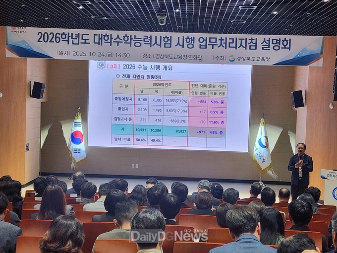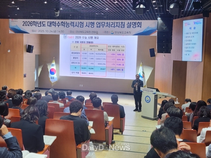 (데일리대구경북뉴스=황지현 기자)경북교육청(교육감 임종식)은 10월 24일 본청 행복지원동 연화관에서 시험지구 도책임감독관과 중앙협력관 등 교육전문직 122명과 시험장 학교 교감 등 교원 74명, 총 196명이 참석한 가운데 ‘2026학년도 수능 시행 업무처리지침 설명회’를 개최했다.