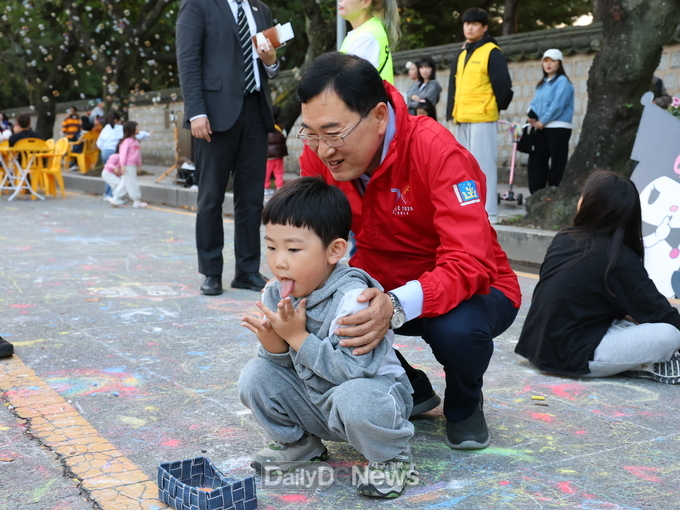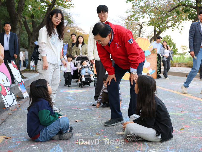 아이들의 손에는 분필이 들려 있었고, 바닥에는 알록달록한 낙서와 그림이 가득해 가을빛 돌담길이 한층 더 활기를 띠었다.