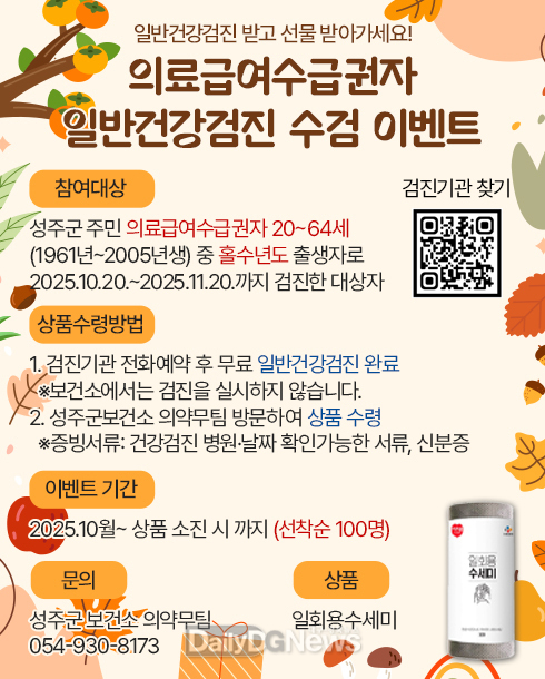 이번 이벤트는 성주군에 거주하는 의료급여수급권자 중 20세에서 64세(1961년~2005년생) 사이의 홀수년도 출생자를 대상으로 진행되며, 2025년 10월 20일부터 11월 20일까지 일반건강검진을 받은 대상자가 참여할 수 있다.