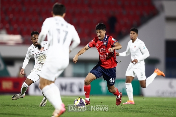 (데일리대구경북뉴스=황지현 기자)김천상무프로축구단(대표이사 이재하)이 11월 1일 오후 4시 30분, 김천종합운동장에서 열린 ‘하나은행 K리그1 2025’ 35R 홈경기에서 포항스틸러스(이하 포항)에 0대 1로 경기를 마쳤다. 김천상무는 선수단이 대거 바뀌고 20인 엔트리마저 채울 수 없는 상황에도 불구하고 새로운 가능성을 찾았다.