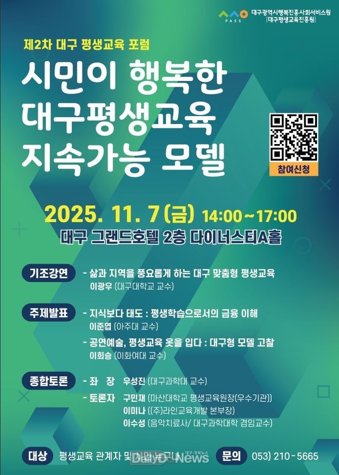 오는 7일(금) 오후 2시부터 대구 그랜드호텔 2층 다이너스티A홀에서 열리며 ‘시민이 행복한 대구평생교육 지속가능 모델’을 주제로 지역 평생교육의 현황을 점검하고, 시민이 체감할 수 있는 행복 중심의 지속가능한 평생학습 모델을 모색하기 위해 마련됐다.