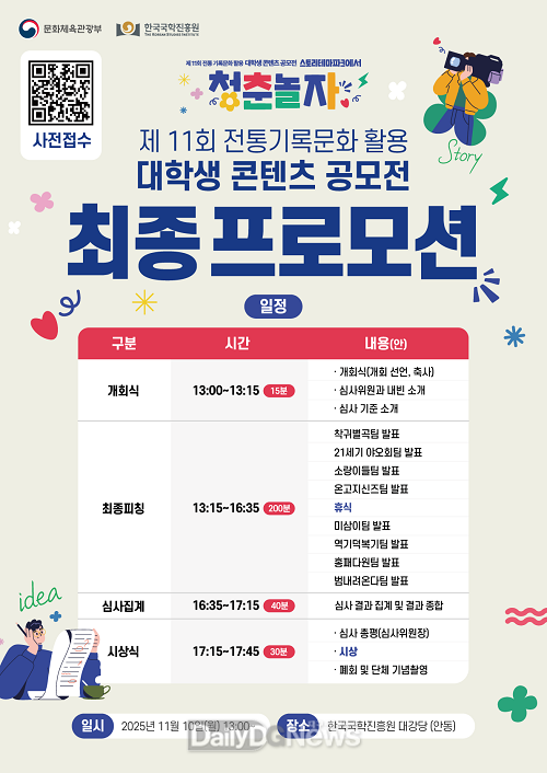 (데일리대구경북뉴스=황지현 기자)한국국학진흥원(원장 정종섭)은 문화체육관광부(장관 최휘영)가 주최하고 한국국학진흥원이 주관한 ‘제11회 전통 기록문화 활용 대학생 콘텐츠 공모전’의 최종 프로모션을 오는 11월 10일 오후 1시에 한국국학진흥원 대강당에서 실시할 예정이다. 약 5개월간 이어진 프로그램이 비로소 대단원을 맞이하고 있다.