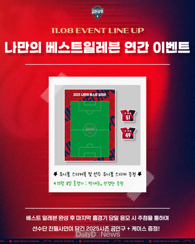 김천상무는 오는 강원전 다양한 연간 이벤트로 홈팬을 맞이한다. 먼저 ‘나만의 베스트 일레븐’ 이벤트에서 유니폼 스티커북과 함께 박태준, 민경현 스티커를 증정한다. 베스트 일레븐을 완성 후 마지막 홈경기 당일 응모 시 추첨을 통해 선수단 친필사인 공인구와 케이스를 받을 수 있다.