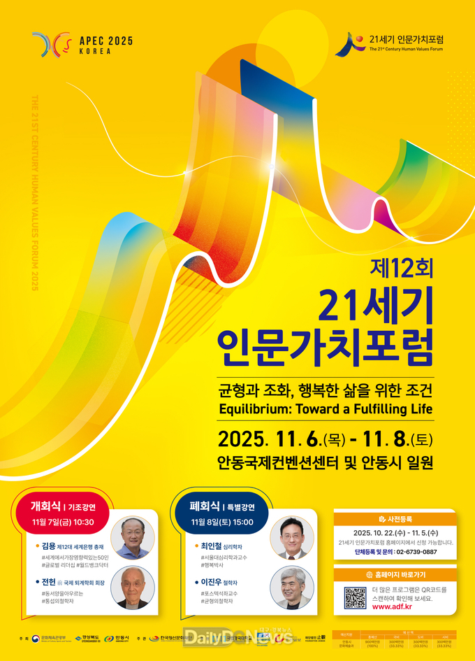 (데일리대구경북뉴스=황지현 기자)문화체육관광부, 경상북도, 안동시가 공동 주최하고 한국정신문화재단이 주관하는 ‘제12회 21세기 인문가치포럼’이 11월 6일부터 8일까지 3일간 안동국제컨벤션센터(ADCO)와 안동시 일원에서 열린다.