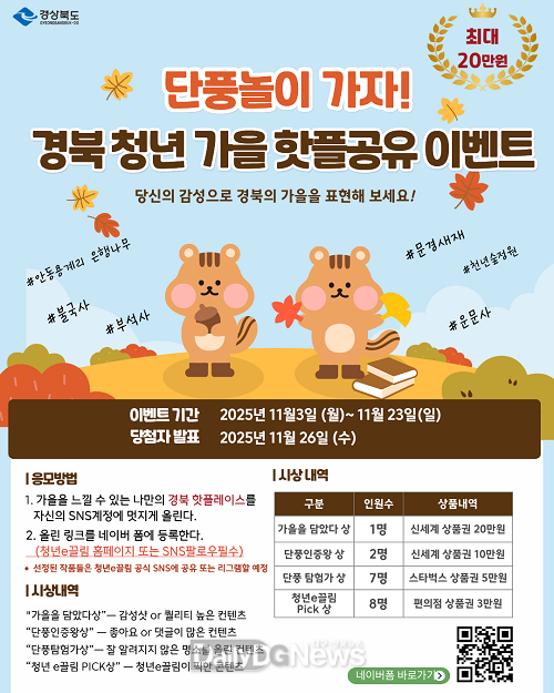 지진태 경상북도 청년정책과 과장은 “이번 이벤트를 통해 청년들이 직접 참여하며 지역의 매력을 새롭게 발견하고, SNS를 통해 경북의 아름다운 가을을 널리 알릴 수 있는 계기가 되길 바란다”며 “앞으로도 청년e끌림 플랫폼을 중심으로 청년이 주도적으로 참여하는 다양한 이벤트를 제공할 계획”이라고 밝혔다.
