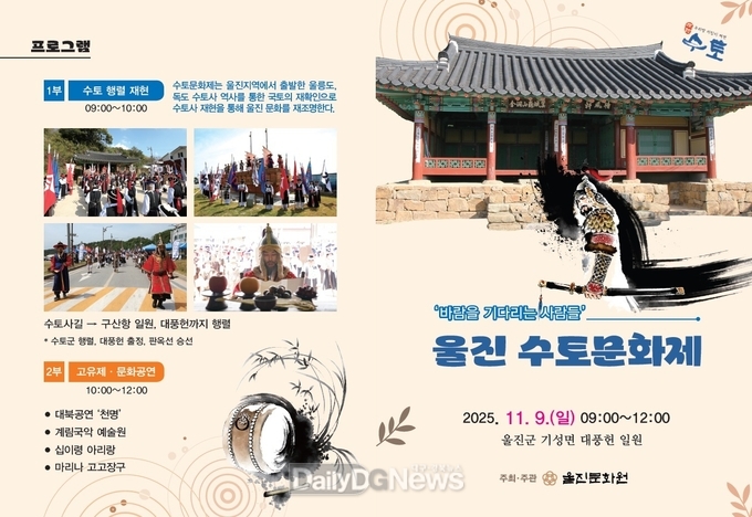(데일리대구경북뉴스=양승미 기자)=울진군(군수 손병복)은 오는 11월 9일 기성면 대풍헌 일원에서 조선시대 울릉도·독도 수호를 위해 파견되었던 수토사의 숭고한 정신을 기리는‘2025 울진 수토문화제’를 개최한다.