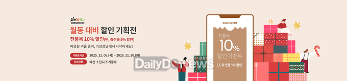 (데일리대구경북뉴스=김형만 기자)의성군(군수 김주수)이 운영하는 온라인 농특산물 쇼핑몰 ‘의성장날’이 겨울철을 앞두고 지역 농·특산물 소비 촉진을 위한 ‘월동 대비 할인 기획전’을 진행한다.