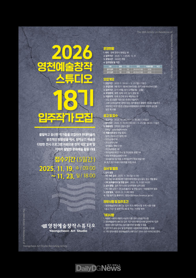 (데일리대구경북뉴스=양승미 기자)=영천시는 오는 19일부터 23일까지 2026년 영천예술창작스튜디오 제18기 입주작가를 모집한다.