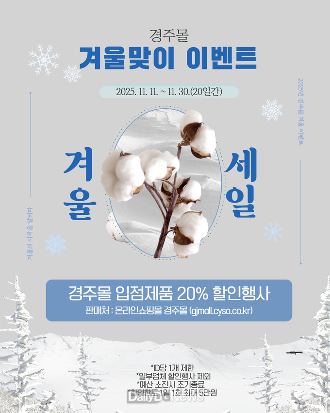 (데일리대구경북뉴스=양승미 기자)=경주시는 지역 농특산물 온라인 쇼핑몰 ‘경주몰’이 겨울을 맞아 입점 제품 20% 할인 이벤트를 진행한다고 9일 밝혔다.