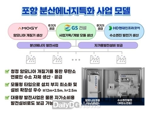 포항시가 제안한 분산에너지 특화지역 사업모델은 ‘청정 암모니아 기반 무탄소 분산에너지 실증사업’이다. 이 사업은 그린·블루 암모니아 등 청정연료를 개질해 수소를 생산하고, 수소엔진발전기를 통해 전력을 생산하는 방식으로 화석연료를 전혀 사용하지 않는 ‘완전한 무탄소 발전모델’이라는 점이 핵심이다.