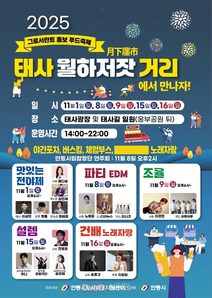‘그로서란트’는 복합외식공간을 의미하며, 여행자 쉼터 기능을 더한 안동시도시재생지원센터 1․2층 공간을 홍보하기 위한 축제다. ‘태사 월하저잣(月下廛市)’이라는 부제 아래, 먹거리와 문화 콘텐츠를 함께 즐길 수 있는 축제로, 관광객과 시민들이 함께 어울려 지역의 새로운 공간인 ‘그로서란트’를 중심으로 다양한 체험과 공연이 마련됐다.
