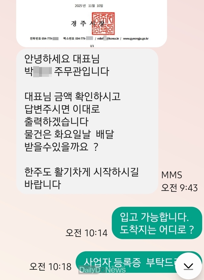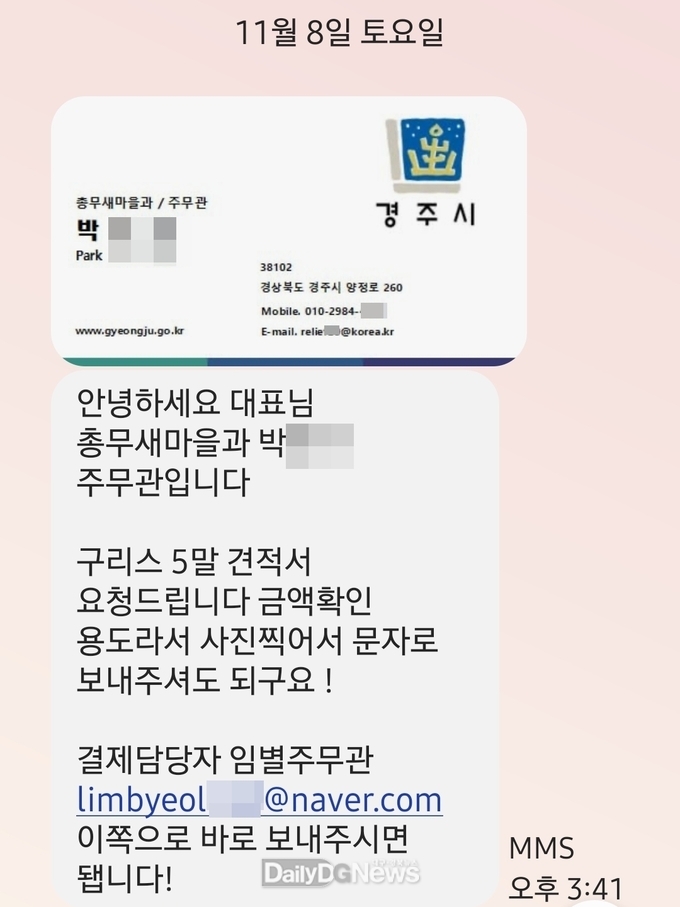 주낙영 경주시장은 “실제 재직 중인 공무원의 이름과 부서까지 도용된 정교한 수법으로 시민 피해로 이어질 가능성이 높다”며 “경주시는 문자나 SNS를 통해 견적이나 거래를 요청하지 않으니, 유사한 연락을 받으면 반드시 시청 대표번호로 연락해 사실 여부를 확인해 달라”고 강조했다.