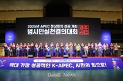 (데일리대구경북뉴스=양승미 기자)=경주시가 2025년 APEC 정상회의 개막을 한 달 앞두고 시민의 힘을 하나로 모아 성공개최 의지를 다졌다. 시는 30일 경주실내체육관에서 ‘2025년 APEC 정상회의 성공개최 범시민실천결의대회’를 성황리에 개최했다고 밝혔다. 이번 행사에는 APEC 범시도민지원협의회(공동회장 박몽룡·이상걸) 소속 회원을 비롯해 유관기관, 시민단체, 자원봉사자 등 경주시민 3천여 명이 참석해 시민과 함께하는 APEC의 진정한 의미를 되새겼다. 특히 주낙영 경주시장을 비롯해 김석기 국회 외교통일위원장, 이동협 경주시의장, 최병준 경북도의회 부의장을 비롯해 시·도의원 전원이 참석해 시민과 함께 손님맞이 실천 결의를 다지고 성공 개최를 향한 열기를 더했다. 행사장 내부에는 시민단체들이 자체 제작한 손님맞이 실천 결의 현수막이 곳곳에 걸려 있어, APEC 성공개최를 향한 시민들의 뜨거운 참여 의지를 생생하게 보여주었다. 본행사에 앞서 참석자들은 ‘APEC 시민 10대 실천과제’를 함께 되새기며, 모든 시민이 APEC의 주인으로서 행동할 때 성숙한 시민의식과 지속가능한 경주를 만들어 갈 수 있다는 공감대를 형성했다. 이어 APEC 유치 도전부터 개최