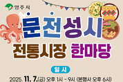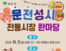 (데일리대구경북뉴스=양승미 기자)=영주시는 전통시장의 활력 회복과 지역 상권 활성화를 위해 오는 7일 영주365시장 무대 일원에서 ‘전통시장 문전성시 한마당’ 행사를 개최한다고 밝혔다 올해 행사는 ‘문어랑 전이랑! 문전성시 영주!’를 주제로, 시민과 상인이 함께 즐기는 축제의 장으로 마련됐다. ‘문전성시(門前成市)’라는 이름처럼, 문 앞이 사람들로 북적이는 활기찬 전통시장의 풍경을 재현하겠다는 의미를 담고 있다. 이번 행사는 오후 1시부터 9시까지 체험·공연·먹거리 프로그램이 이어지며, 시민과 상인이 함께 어울리는 다채로운 전통시장 축제로 펼쳐진다. 본행사는 오후 6시에 시작해 내빈소개와 격려사, 축사로 문을 열고, 이후 지역가수 초청공연 등 다채로운 무대가 이어지며 전통시장의 밤을 더욱 흥겹게 만들 예정이다. 상시 프로그램으로는 비석치기·사방치기 등 전통놀이 체험, 에코백 만들기와 플로깅 키트 만들기 등 시민 참여형 체험이 준비됐다. 또한 오후 6시부터 9시까지 먹거리 장터가 운영되어 ‘문어’와 ‘전’ 등 시장의 별미를 맛볼 수 있는 장터 분위기가 조성된다. 특히 시장 상인들이 직접 준비한 다양한 먹거리 부스가 마련돼, 영주365시장만의 따뜻한 인심과 정겨