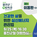 (데일리대구경북뉴스=양승미 기자)=울진군(군수 손병복)은 오는 9월 25일 오후 4시 30분 울진군청 대회의실에서‘교육하는 의사’이동환 의사를 초청해‘건강한 삶을 위한 심신에너지 관리법’을 주제로 제32회 목요특강을 개최한다. 이동환 의사는 직무스트레스연구소 원장이자 유튜브 구독자 110만 명을 보유한 건강 전문 크리에이터로, 다수의 방송과 저서를 통해 대중에게 쉽고 실천 가능한 건강 관리법을 전해왔다. 이번 특강은 일상에서 바로 실천할 수 있는 건강 관리 방법을 다루며, 특히 현대인이 겪는 만성피로와 스트레스 해소를 위한 구체적 대안을 제시해 군민들에게 실질적인 도움이 될 것으로 기대된다. 손병복 울진군수는 특강에 앞서“바쁜 일상 속에서도 몸과 마음의 균형을 지키는 것이 무엇보다 중요하다”며“이번 특강을 통해 군민들께서 건강을 관리하는 새로운 지혜를 얻고, 더 행복하고 활력 있는 생활을 이어가시길 바란다”라고 말했다. 한편, 제33회 목요특강은 오는 10월 16일(목) 오후 5시, 울진문화예술회관에서 개최할 예정이며, 방송인 서경석을 초청해‘작은 변화가 미래를 바꾼다’를 주제로 강연이 진행될 예정이다.