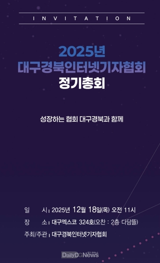 (데일리대구경북뉴스=이준호 기자) 대구경북인터넷기자협회가 12월 18일 대구 엑스코에서 2025년도 정기총회를 개최한다고 밝혔다.