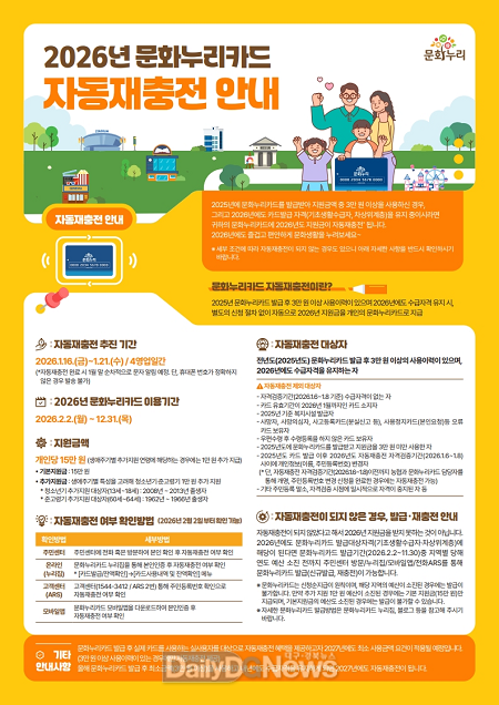 (데일리대구경북뉴스=김형만 기자)경상북도(도지사 이철우)와 경북문화재단(대표이사 김재수)은 1월 16일부터 1월 21일까지 문화누리카드 자동재충전이 진행할 예정이다.
