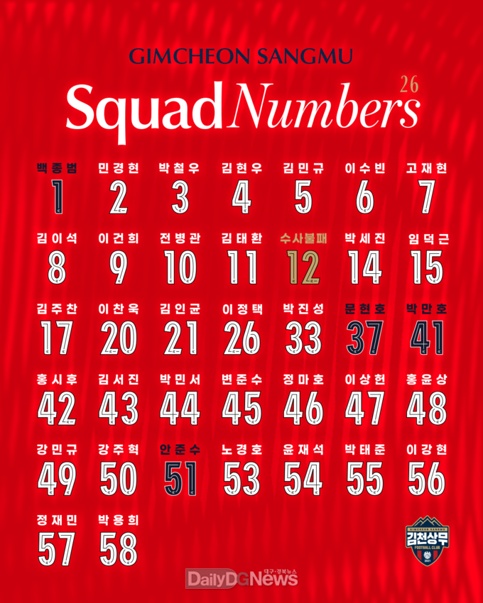 (데일리대구경북뉴스=황지현 기자)김천상무가 2026시즌 프로선수단 배번을 공개했다.