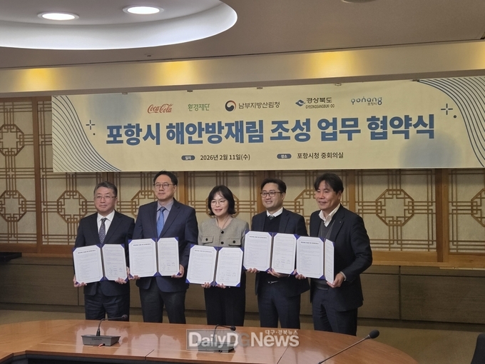 (데일리대구경북뉴스=황지현 기자) 경상북도산림환경연구원은 2월 11일 포항시청에서 한국 코카-콜라, 환경재단, 남부지방산림청, 포항시와 포항시 흥해읍 용한리 일원 해안방재림 조성사업을 위한 업무협약을 체결했다.