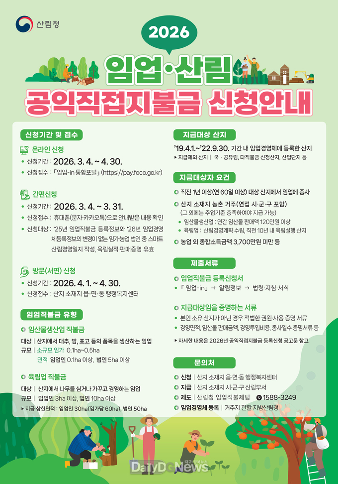 (데일리대구경북뉴스=황지현 기자)경상북도는 2026년 임업‧산림 공익직접지불금(임업직불금)신청‧접수를 3월 4일부터 4월 30일까지 진행한다.