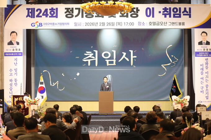 (데일리대구경북뉴스=황지현 기자)(사)구미중소기업협의회는 2월 26일 오후 5시, 호텔 금오산 그랜드볼룸에서 회원사 대표 및 임직원, 김장호 구미시장을 비롯한 유관기관·단체장 등 150여 명이 참석한 가운데 제24회 정기총회 및 회장 이·취임식을 개최했다.