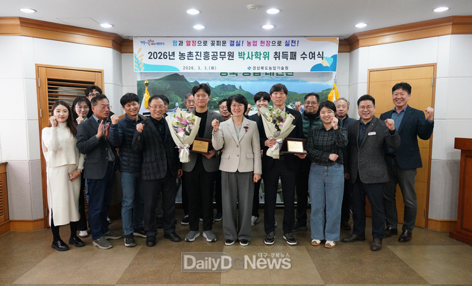 (데일리대구경북뉴스=황지현 기자)경북농업기술원은 3월 3일 전문 연구 역량 강화를 위해 박사학위를 취득한 농촌진흥공무원 2명에게 박사학위 취득패를 수여하고 격려했다.