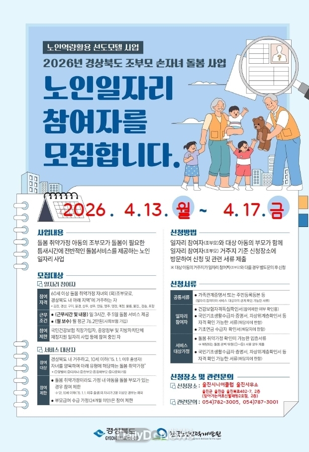 (데일리대구경북뉴스=양승미 기자)=울진군은 초저출산 시대에 따른 가정의 양육 부담을 경감하고 어르신들의 사회참여 활성화를 도모하기 위해 오는 4월 13일부터 17일까지 5일간 2026년 노인일자리 조부모 손자녀 돌봄 사업 참여자 40명을 모집한다고 밝혔다.