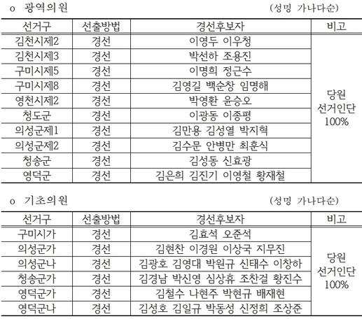(데일리대구경북뉴스=황지현 기자)국민의힘 경북도당 공천관리위원회(위원장 구자근)는 4월 9일 제9회 전국동시지방선거 경북도당 공천관리위원회 제8차 회의 결과에 대해 발표했다.