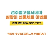 (데일리대구경북뉴스=신명곤 기자)성주별고을시네마(창의문화센터 3층)는 민족 대명절 설을 맞아 2월 6일부터 2월 18일까지 ‘설맞이 선물세트 이벤트’를 진행한다. 지난 추석과 동일하게 선물세트는 6만 원에 영화 관람권 10매와 팝콘세트 1천 원 할인권 10매로 구성됐으며, 세트 단위로만 구매할 수 있다. 특히 구매한 선물세트는 2026년 7월 31일까지 사용할 수 있어 장기간 활용이 가능하다. 다만, 구매 후 환불은 불가하다. 선물세트는 성주별고을시네마 창의문화센터 3층 매표소에서 현장 구매할 수 있다. 착한 가격으로 가족·지인과 함께 영화를 즐기고, 팝콘 할인 혜택까지 누릴 수 있어 명절 선물로도 손색이 없을 것으로 기대된다. 특히 이번 설 시즌에는 화제작들이 대거 포진해 있어 선물세트의 활용도가 더욱 높을 것으로 기대된다. 현재 절찬 상영 중인 사극 대작 ‘왕과 사는 남자’는 물론, 조인성, 박정민 주연의 첩보 액션 영화 ‘휴민트’ 등 화제의 개봉 예정작들이 관객들을 기다리고 있다. 성주별고을시네마에서 이번 선물세트 혜택을 활용하면 대작 영화들을 훨씬 합리적인 가격으로 관람할 수 있다. 성주군 관계자는 “민족 최대의 명절 설을 맞아 준비한 이번 이벤트가