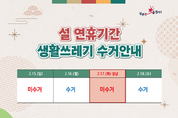 (데일리대구경북뉴스=신명곤 기자)성주군은 설 명절을 맞아 귀성객과 주민들이 쾌적한 환경 속에서 명절을 보낼 수 있도록 2월 2일부터 2월 20일까지 ‘설 연휴 쓰레기 종합관리대책’을 추진한다. 군은 연휴 기간 귀성객과 군민의 생활 불편을 최소화하기 위해 연휴를 전·중·후로 구분한 대응체계를 마련한다. 연휴 전에는 주요거리 등의 쓰레기 중점 수거와 환경정비를 실시하고 음식물쓰레기 증가에 대비한 비상 수거용기를 비치한다. 연휴 중에는 특별상황반을 운영해 생활폐기물 처리와 민원에 대응하며, 읍·면의 상황반과 비상연락체계를 유지한다. 연휴 이후에는 마무리 대청소와 노면청소차 운영을 통해 깨끗한 환경 조성에 힘쓸 계획이다. 특히 명절 선물 포장 등으로 스티로폼 상자와 종이박스 배출이 증가할 것으로 예상됨에 따라, 관내 유통업소에서 판매되는 설 선물류의 과대포장 및 재포장 행위에 대해서도 점검을 실시한다. 또한 주민들에게 배출장소 내 무분별한 투기를 예방하기 위한 지도·단속과 함께 재활용품 올바른 분리배출 방법에 대한 홍보를 강화할 예정이다. 자원순환사업소 관계자는 “설 명절 기간 생활폐기물 발생량이 급증할 것으로 예상된다”며 “원활한 수거 처리와 청결한 환경 유지를