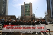 (데일리대구경북뉴스=이준호 기자) 대구공무원노동조합(위원장 김영진)과 대구교육청공무원노동조합(위원장 윤태희), 대구교사노동조합(위원장 직무대행 서모세)은 ‘행정통합을 반대하는 대구 공무원노조 연대’를 명의로 2월 6일 대구시청 동인청사 앞에서 긴급 기자회견을 가졌다. 이날 기자회견은 절차적 정당성이 결여된 ‘대구경북 행정통합’의 독단적 졸속 추진을 반대하고, 제출된 특별법안 폐기와 함께 통합 추진의 즉시 중단을 요구하기 위해서이다. 대구공무원노동조합 김영진 위원장은 “이토록 중요한 행정통합을, 그동안 기득권을 유지하고 싶어 지지부진하게 추진해 오던 것을 지금이 적기이고 골든타임이라며 모든 절차와 시도민의 의사를 무시한채 속도전으로 밀어붙이는 것은 그 정당성을 상실했다.”라며, “직원복지에는 권한대행의 직무범위 밖이라고 철저히 외면하더니 정작 심사숙고하며 신중을 기해야할 행정통합 추진에는 딴 사람처럼 행동한다.”라며 김정기 대구시장 권한대행을 비난했다. 대구교육청공무원노동조합 윤태희 위원장도 “교육만큼은 정치적 계산이나 경제적 논리에 휘둘리지 않고 안전한 울타리가 되어야 한다.”라며, “위에서부터의 통합이 지역발전의 수단인지 선거전략의 도구인지 의심하지 않을