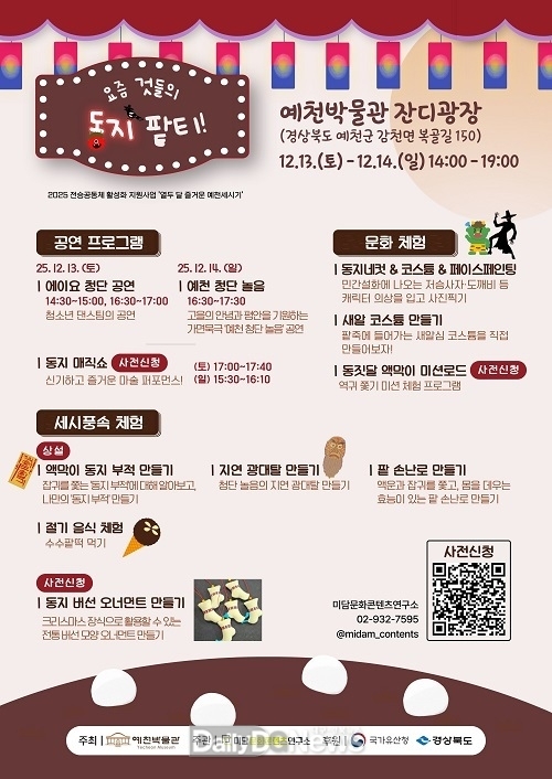 (데일리대구경북뉴스=황지현 기자)예천군(군수 김학동) 예천박물관은 동지 풍속에 담긴 의미를 체험과 놀이로 풀어낸 문화행사 ‘요즘 것들의 동지 팥티!’를 12월 13일부터 14일까지 운영한다.