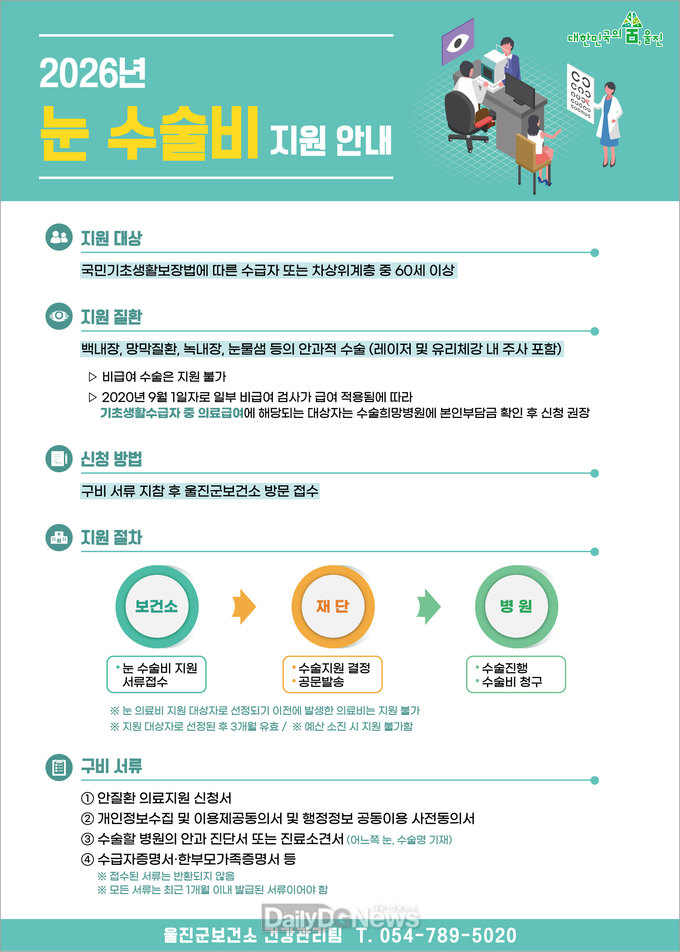 (데일리대구경북뉴스=양승미 기자)=울진군은 60세 이상 저소득층 어르신을 대상으로 2026년 백내장 등 눈 수술비 지원사업을 추진해 노년기 시력 보호와 의료비 부담 완화에 나선다.