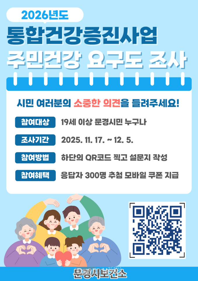 이번 조사는 2026년도 통합건강증진사업의 우선순위와 핵심 성과지표 선정 등 주민들의 건강 수요와 지역사회 특성을 반영한 보건정책 추진을 위해 마련됐으며, 설문 내용은 △통합건강증진사업 인식도 △서비스 만족도 △사업대상 우선순위 △건강증진사업 선호도 등 총 12개 문항으로 구성했다.