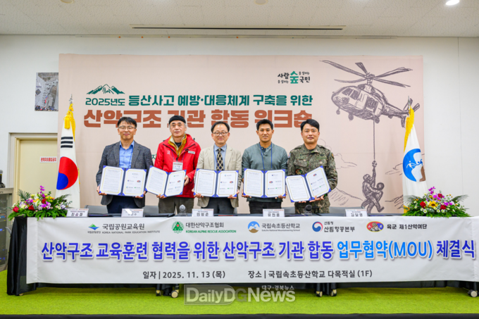 이번 협약에는 국립속초등산학교를 비롯해 산림항공본부, 육군 제1산악여단, 국립공원교육원, (사)대한산악구조협회 등 산악구조 관련 5개 기관이 참여했다.