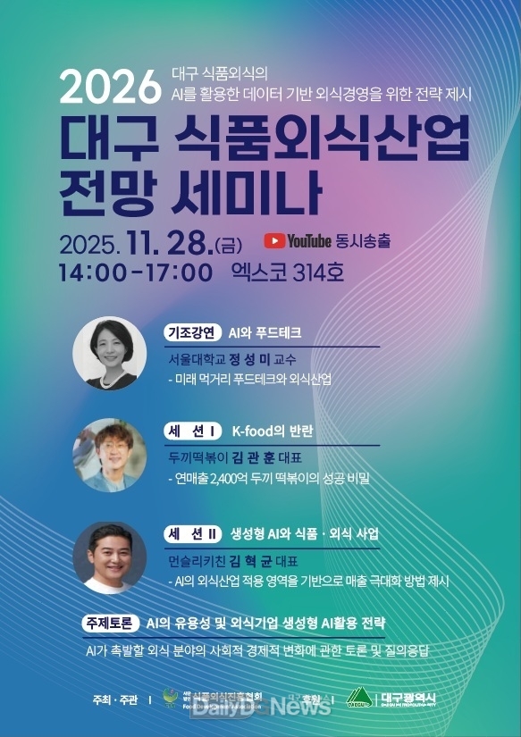 (데일리대구경북뉴스=이준호 기자) 대구시와 (사)식품외식진흥협회는 11월 28일 오후 2시, 엑스코 서관 314호에서 ‘2025년 제3회 2026 식품·외식산업 전망 세미나’를 개최한다고 밝혔다.