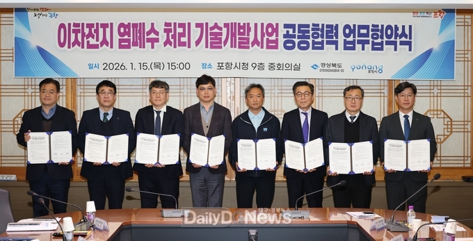 (데일리대구경북뉴스=김형만 기자)경상북도는 1월 15일 포항시청 중회의실에서 이차전지 산업의 난제로 꼽히는 염폐수 처리 기술개발을 위한 업무협약(MOU)을 체결했다.