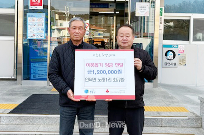 (데일리대구경북뉴스=양승미 기자)=청송군 안덕면에 거주하는 최규환 씨는 지난 15일 안덕면에 ‘희망 2026 나눔 캠페인 이웃돕기 성금’으로 120만 원을 전달했다.