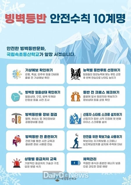 민병준 국립속초등산학교장은 “산악사고가 점차 증가하고 있어 안전 문화를 정착시키는 것이 매우 중요하다”며 “앞으로도 빙벽등반 교육과 연계한 지속적인 안전 캠페인을 통해 겨울 산악사고 예방에 기여하겠다”고 밝혔다.