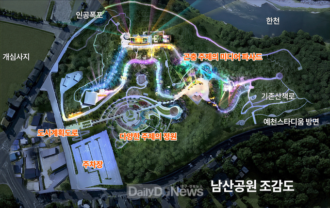 예천을 대표하는 남산공원은 석가산과 정원 등 기존 경관을 살리면서 곤충을 주제로 한 야간경관 콘텐츠를 도입해 새로운 변화를 시도하고 있다.