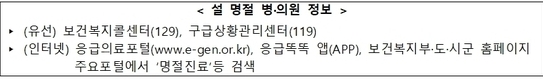 아울러, 외래진료 공백해소와 응급실 과밀화 해소를 위해 문여는 병·의원과 약국을 지정 운영한다. 올 설에는 병의원 1,238개소, 약국 909개소를 운영할 계획으로 지난 추석 대비 168개소를 추가 지정했다. 연휴기간 문 여는 병․의원 및 약국에 대한 정보는 다음에서 확인할 수 있다.