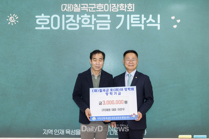 (데일리대구경북뉴스=황지현 기자)㈜재영(대표 이준우)은 2월 2일 지역인재육성과 교육발전을 위해 써달라며 호이장학금 300만원을 (재)칠곡군호이장학회에 기탁했다.