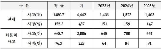 또한, 최근 3년 연평균 화물차 관련 인명 손실 규모는 약 76.3명으로 전체 인명 손실 규모의 50%가 넘는다.