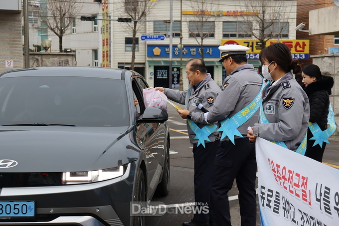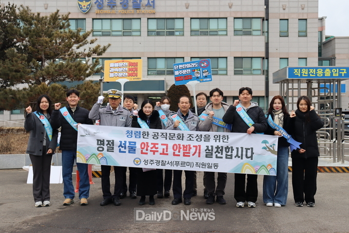 (데일리대구경북뉴스=황지현 기자)성주경찰서(서장 김대정)은 2월 10일 정문 앞 출근길 직원들을 상대로 의무위반예방 캠페인을 실시했다.