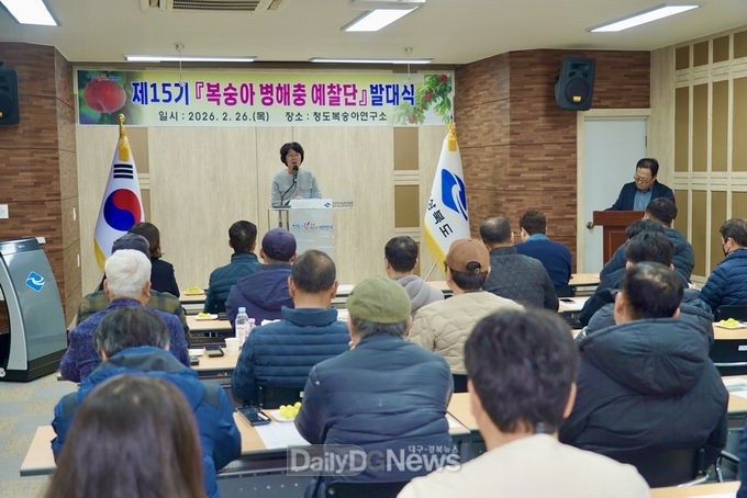 (데일리대구경북뉴스=김형만 기자)경상북도농업기술원은 2월 26일 청도복숭아연구소에서 복숭아 주산지 10개 시군(청도, 영천, 경산 등)에서 선발된‘2026년 복숭아 병해충 예찰단’ 발대식을 열고 본격 활동에 들어갔다.